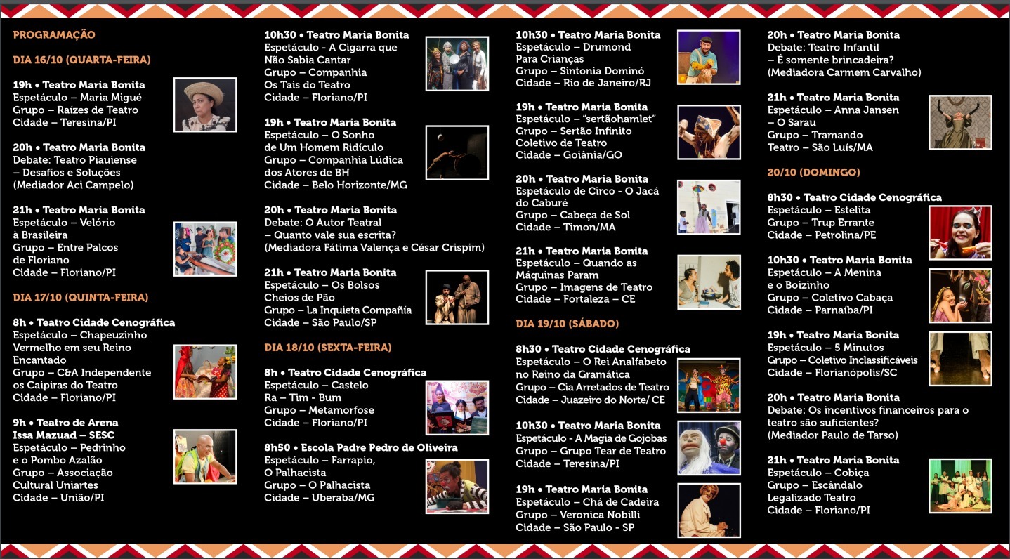O tradicional Festival Nacional de Teatro do Piauí chega à sua 12ª edição. No período de 16 a 20 de outubro, grupos de diversos estados se apresentam em Floriano com programação adulta e infantil. O evento é gratuito e os espetáculos serão distribuídos nos teatros Maria Bonita e Cidade Cenográfica. O festival também conta com laboratórios de arte cênica para profissionais da cultura e população em geral.